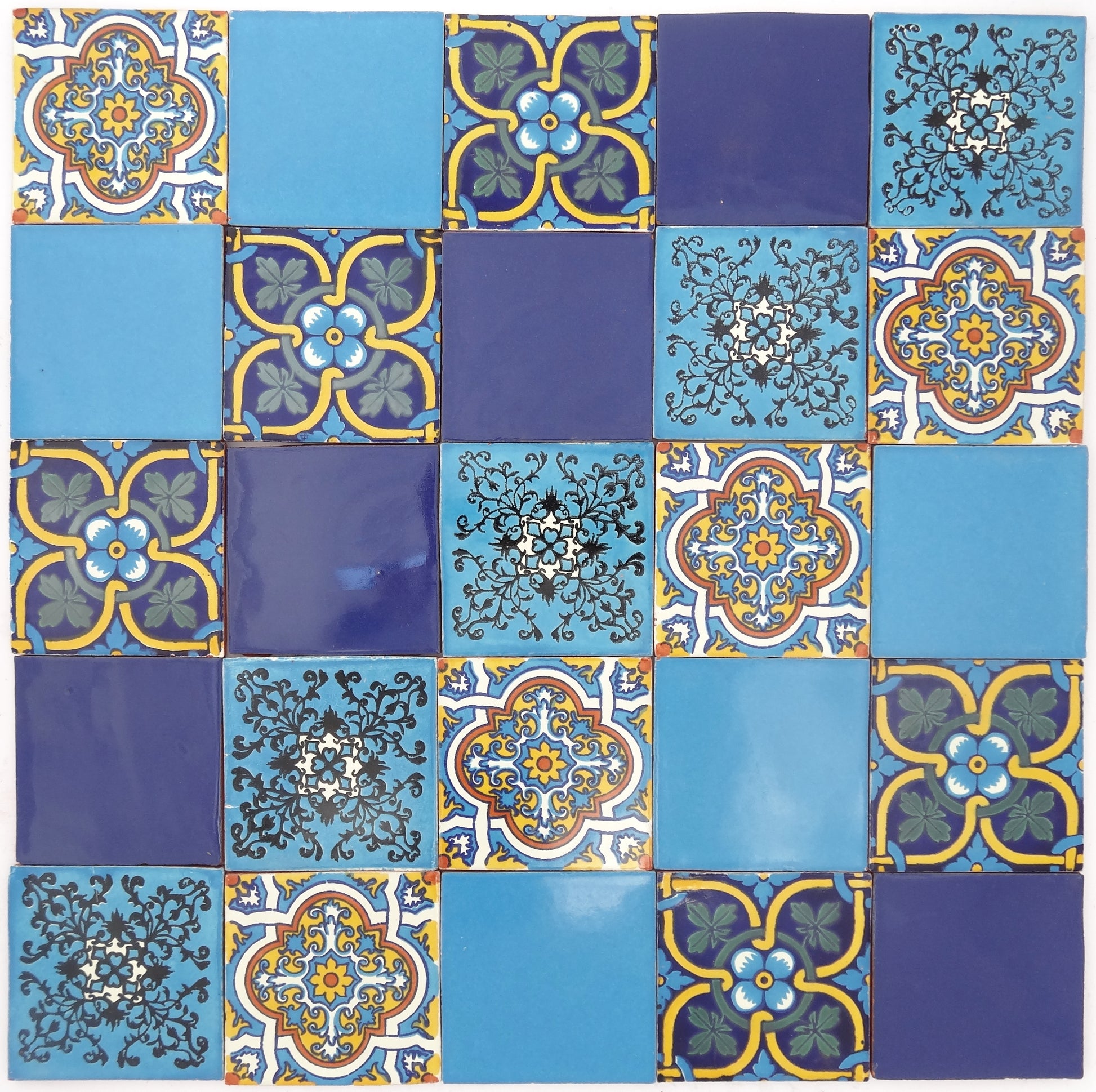 A pack of 25 assorted handmade, glazed, 10.5cm Talavera tiles made in the colonial city of San Miguel de Allende, decorated using the silk screen process with traditional Mexican designs. This pack includes patterns containing the following colours: Blue, Royal Blue, Light Blue, Turquoise, Yellow, Orange, Green, White and Black.